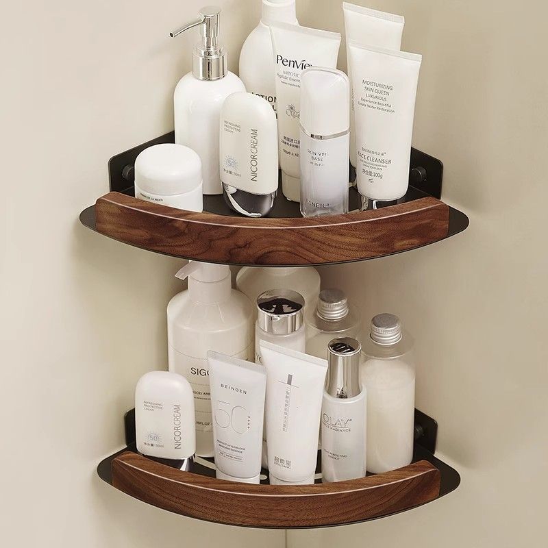 Exklusiv hörnhylla med valnötsdetaljer (borrfri)