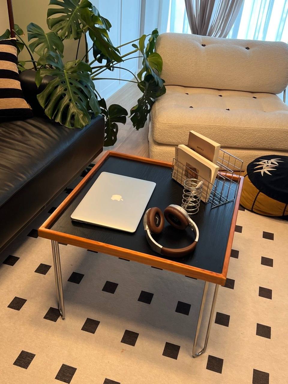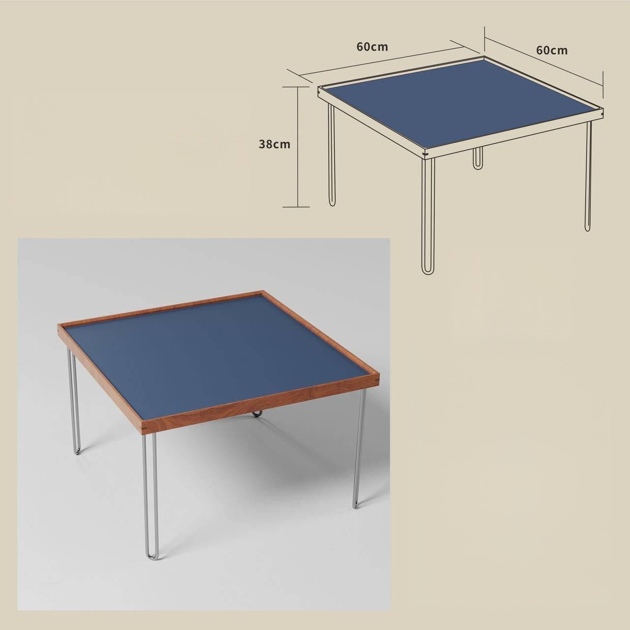 🔹 Stilren nordisk design: Färgad bordsskiva med naturlig träkant och eleganta metallben.
