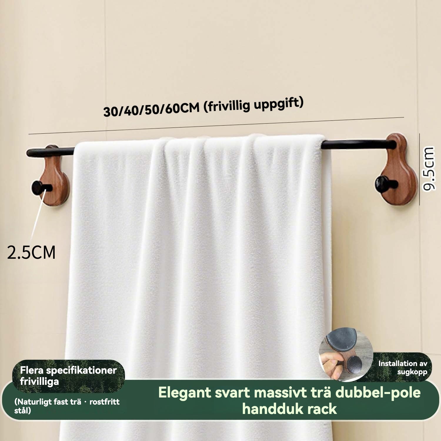 Ge ditt badrum en unik och varm känsla med denna vackra handdukshängare. Den kombinerar en organisk, vintage-inspirerad form i valnötsträ med en stilren, mattsvart metallstång. Tack vare de starka sugpropparna monteras den på sekunder utan att du behöver borra, och de små knopparna ger extra upphängningsmöjligheter.