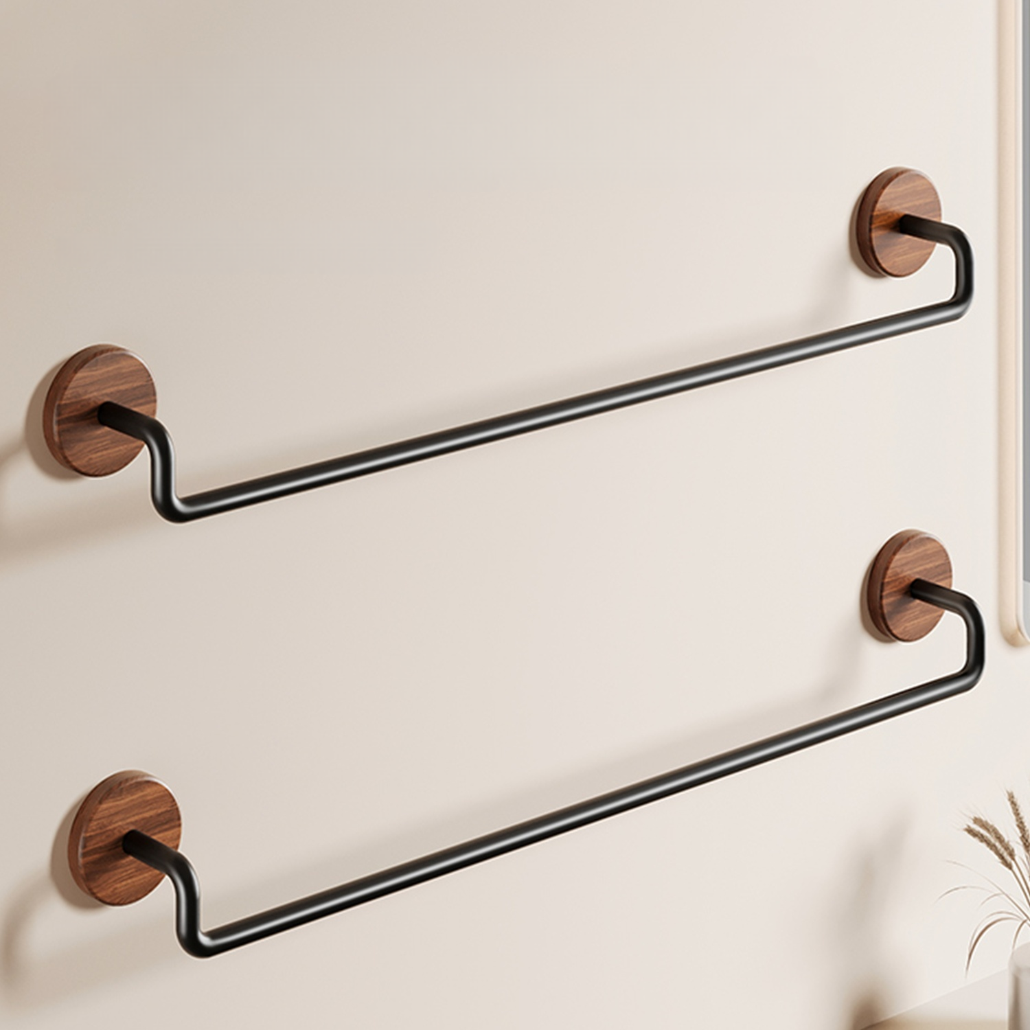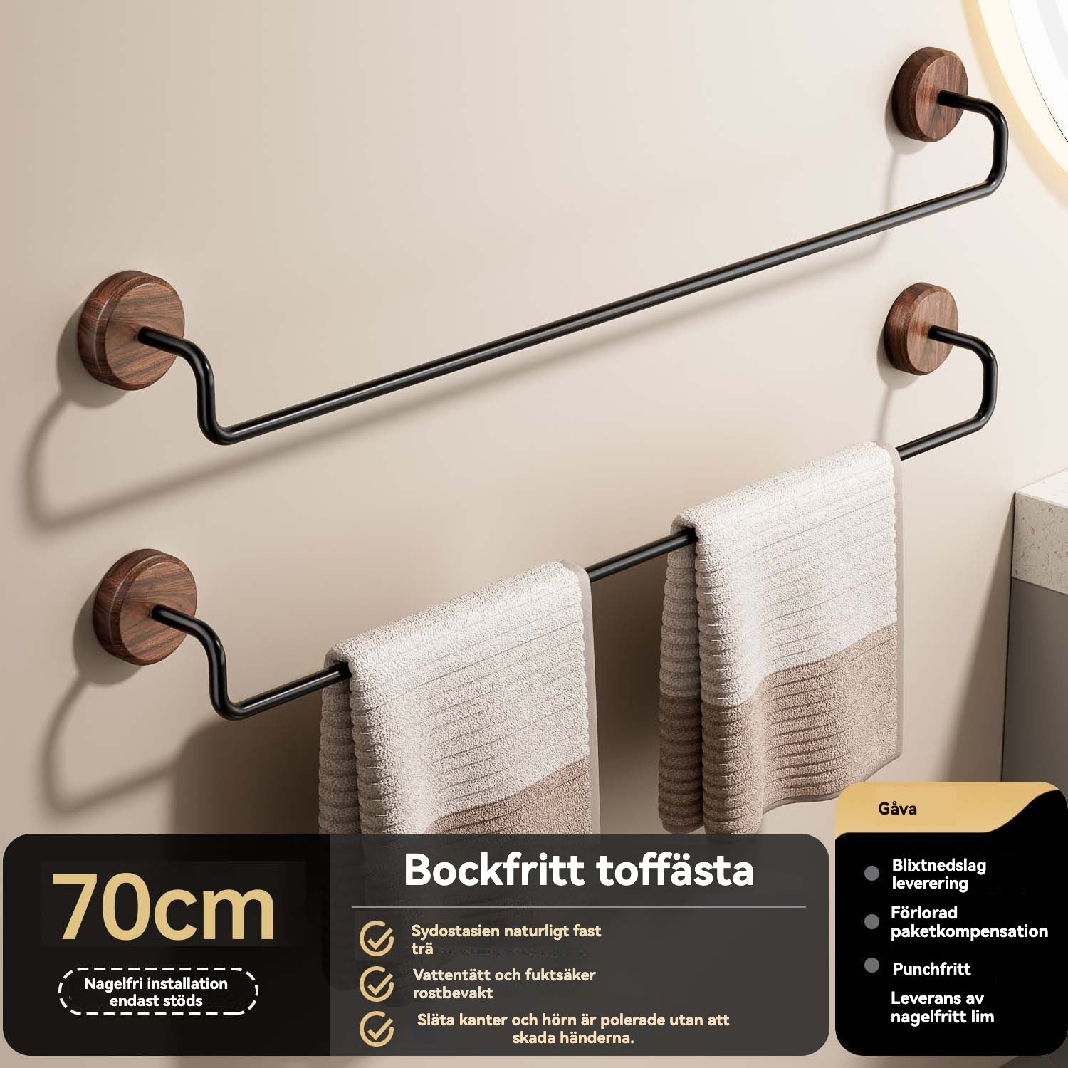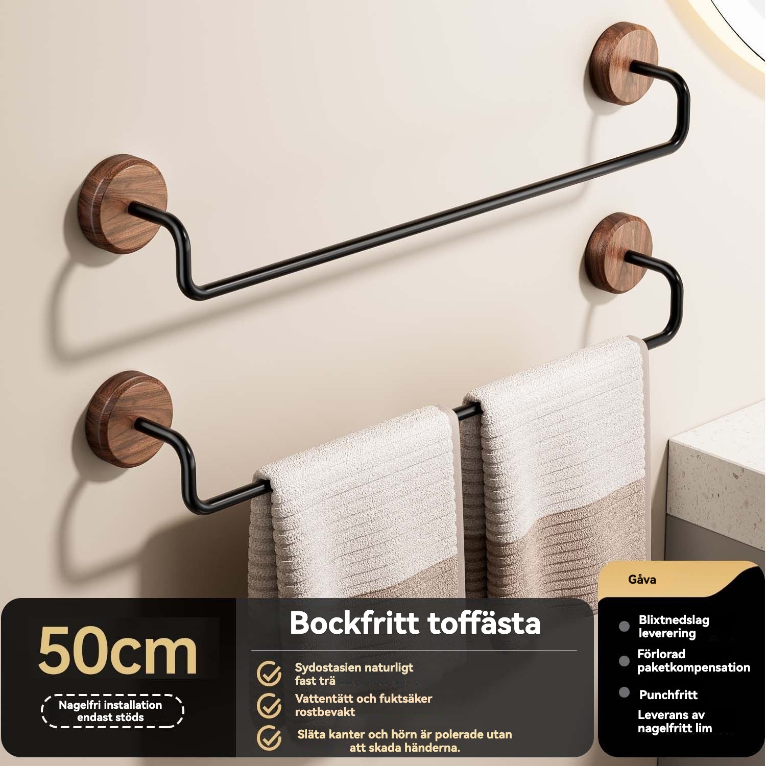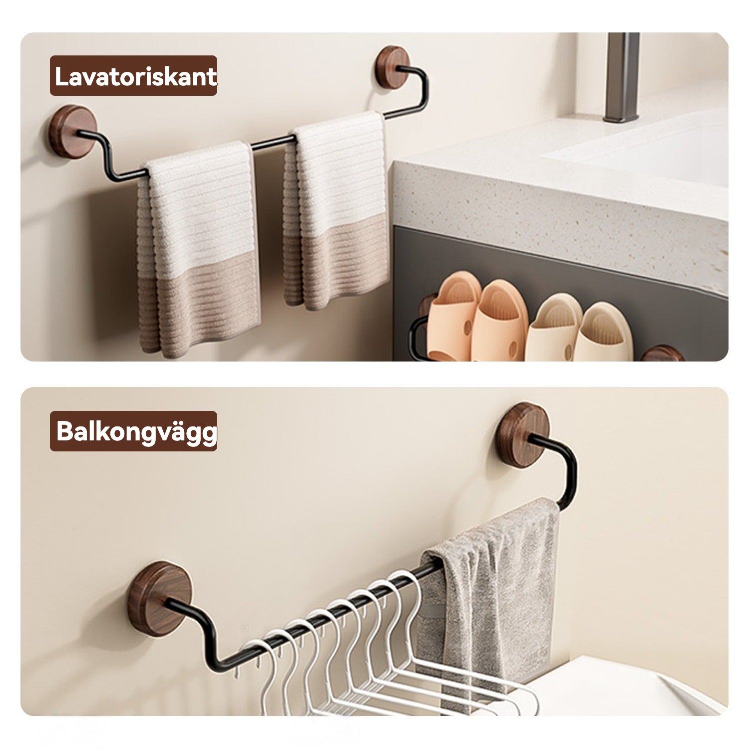 Organisera ditt hem med stil. Denna minimalistiska och multifunktionella hängare kombinerar värmen från äkta valnötsträ med stilren, mattsvart metall. Perfekt för handdukar i badrummet, tofflor i hallen eller till och med för galgar på balkongen. Monteras enkelt utan att borra och finns i flera storlekar för att passa dina behov.