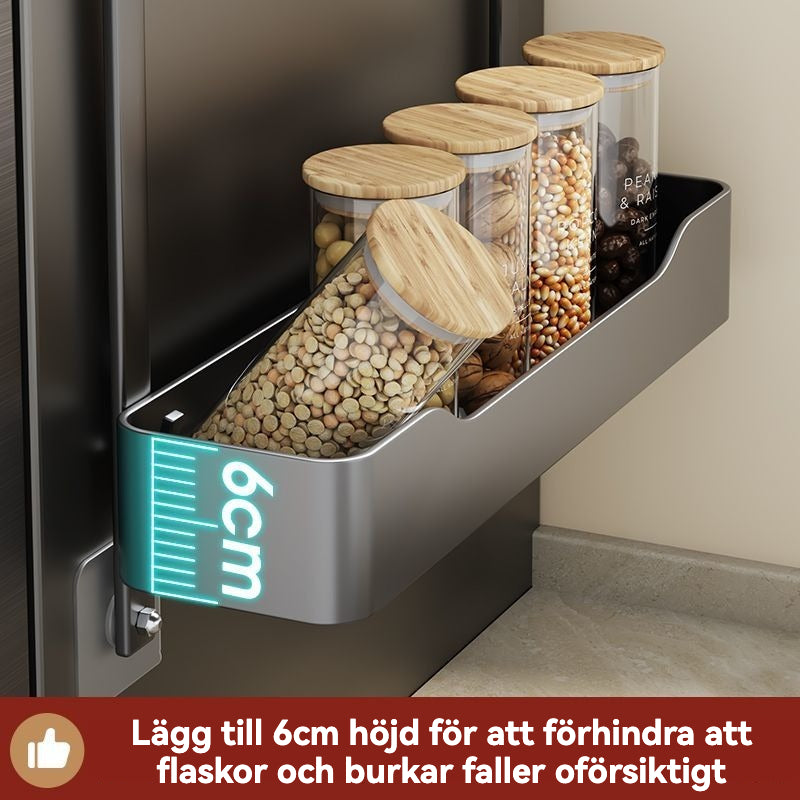Säker design med hög kant: Varje hyllplan har en 6 cm hög skyddskant som effektivt förhindrar att flaskor och burkar ramlar ner.