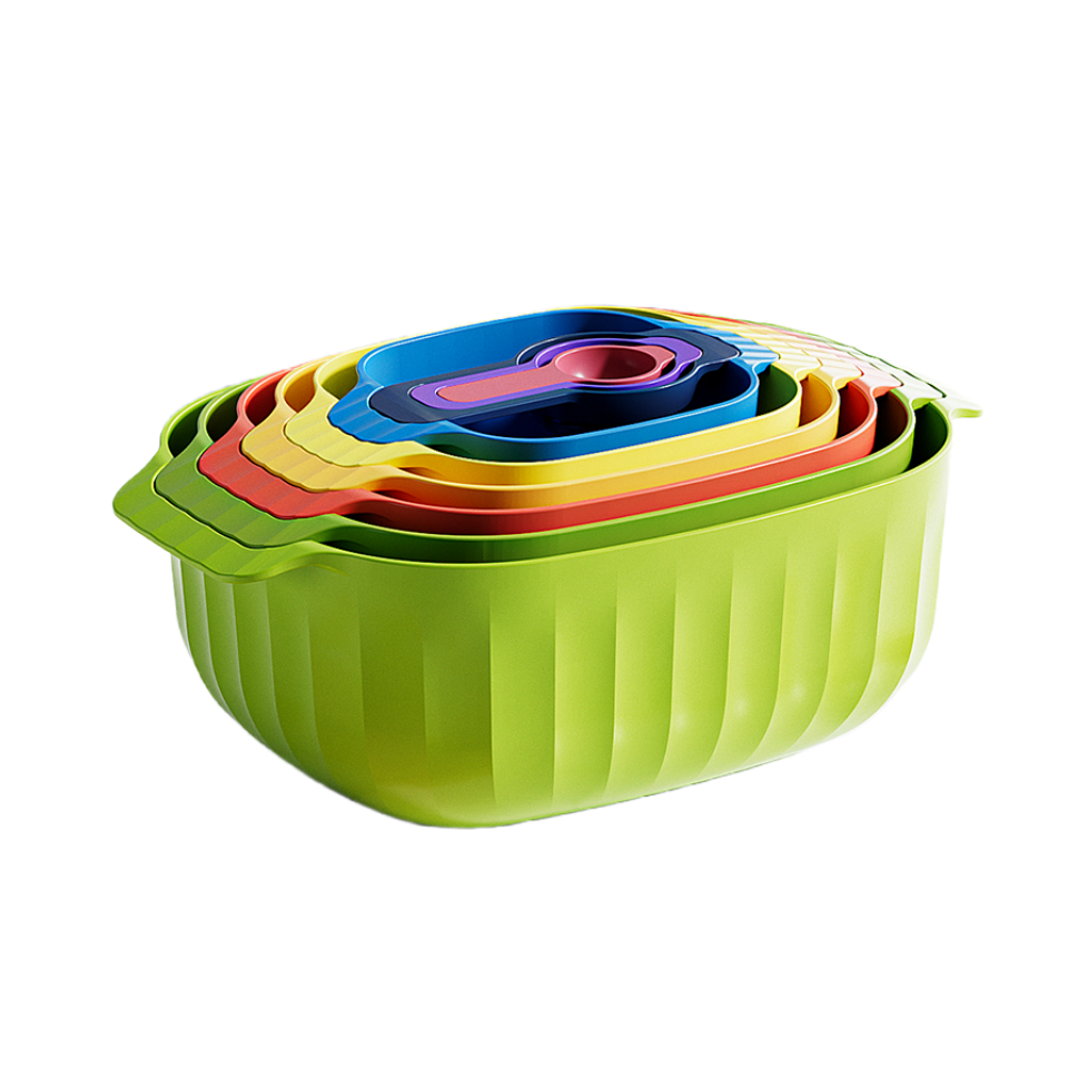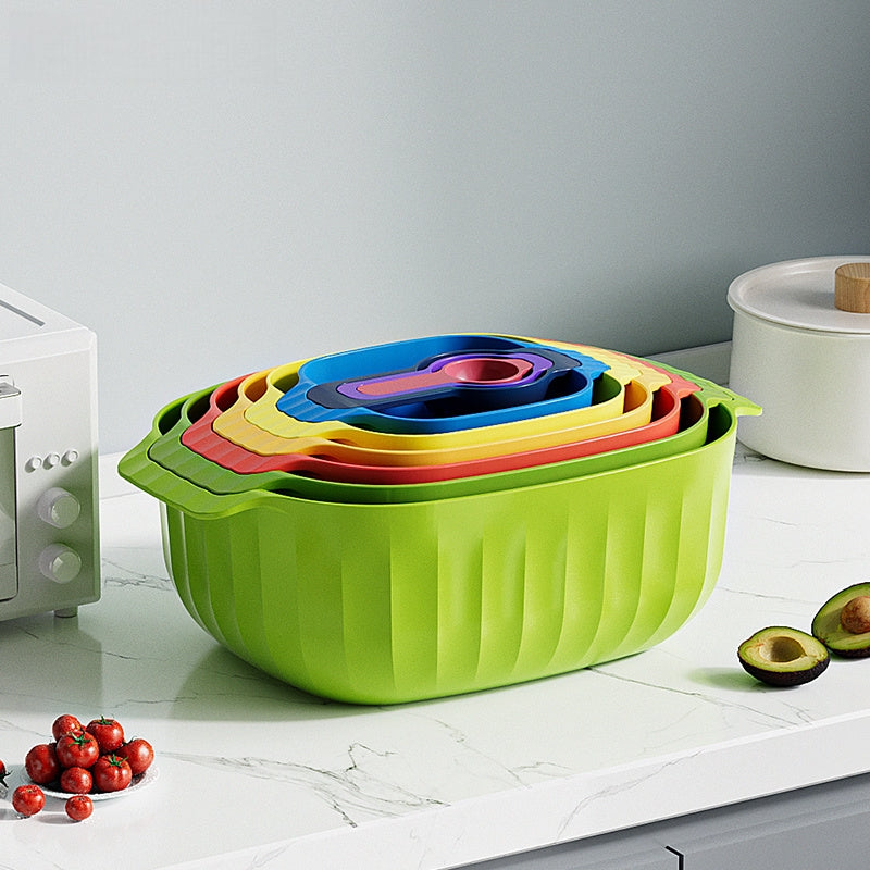 Ett komplett och färgglatt set med allt du behöver för matlagningen, från att skölja grönsaker till att mäta ingredienser. Den smarta, stapelbara designen gör att alla nio delar tar minimalt med plats i köksskåpet, vilket gör det till den perfekta hjälpredan i varje kök.