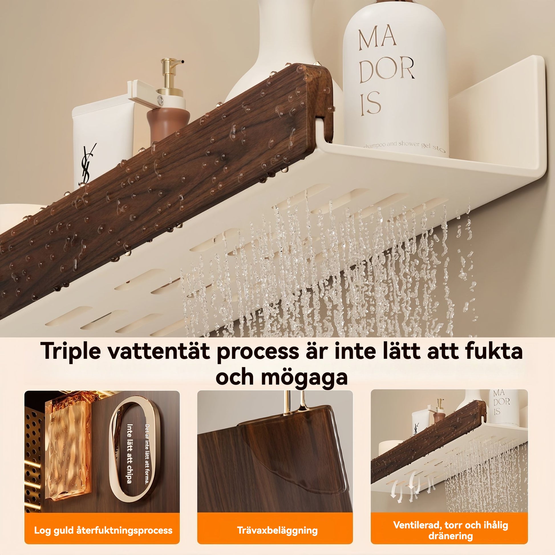 Skapa en ljus och harmonisk känsla i ditt badrum med denna minimalistiska vägghylla. Den vackra kombinationen av äkta valnötsträ och en silkesmatt, vit bas ger en elegant och modern "Japandi"-look. Perfekt för att hålla dina hudvårdsprodukter och parfymer vackert organiserade.
