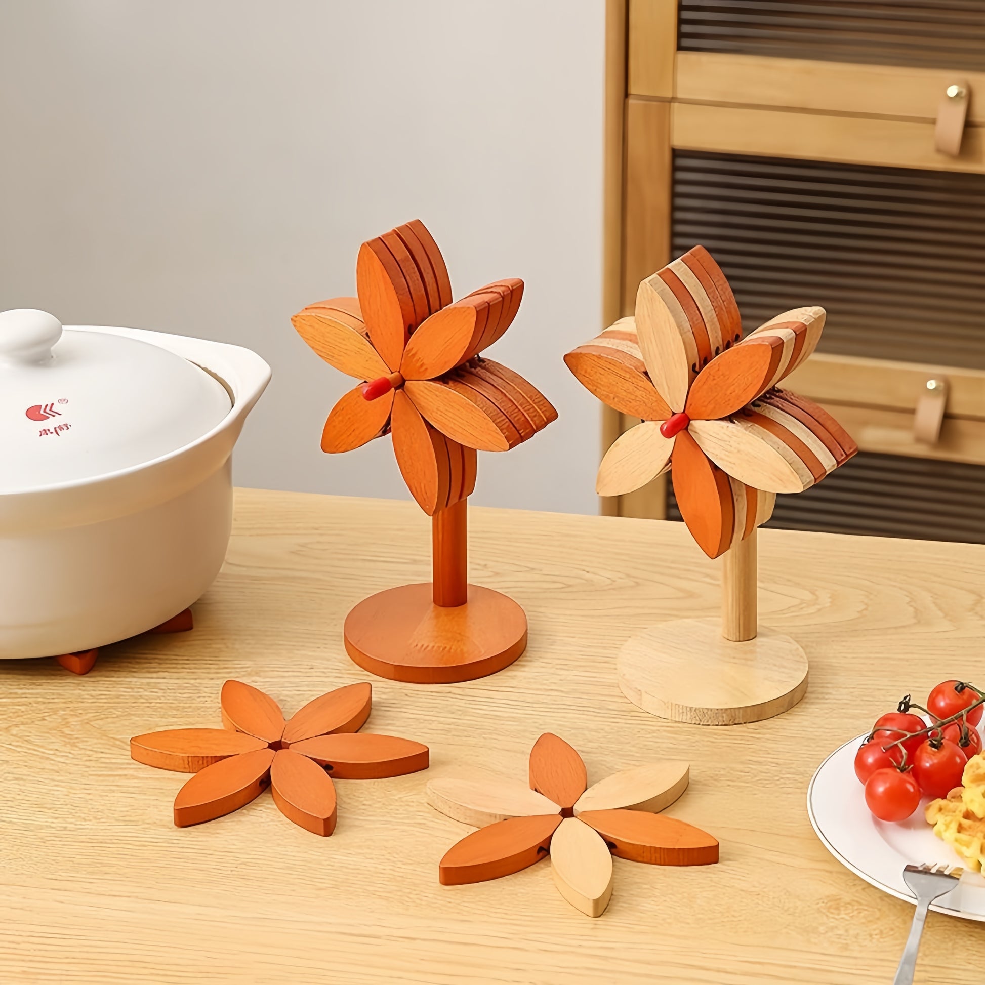 En smart och vacker inredningsdetalj som med ett enkelt handgrepp förvandlas till ett praktiskt grytunderlägg. När det inte används står den eleganta i sitt utseende som en dekorativ vindsnurra eller blomma. När det är dags för middag fäller du ut den för att skydda ditt bord från varma kastruller, fat och koppar.