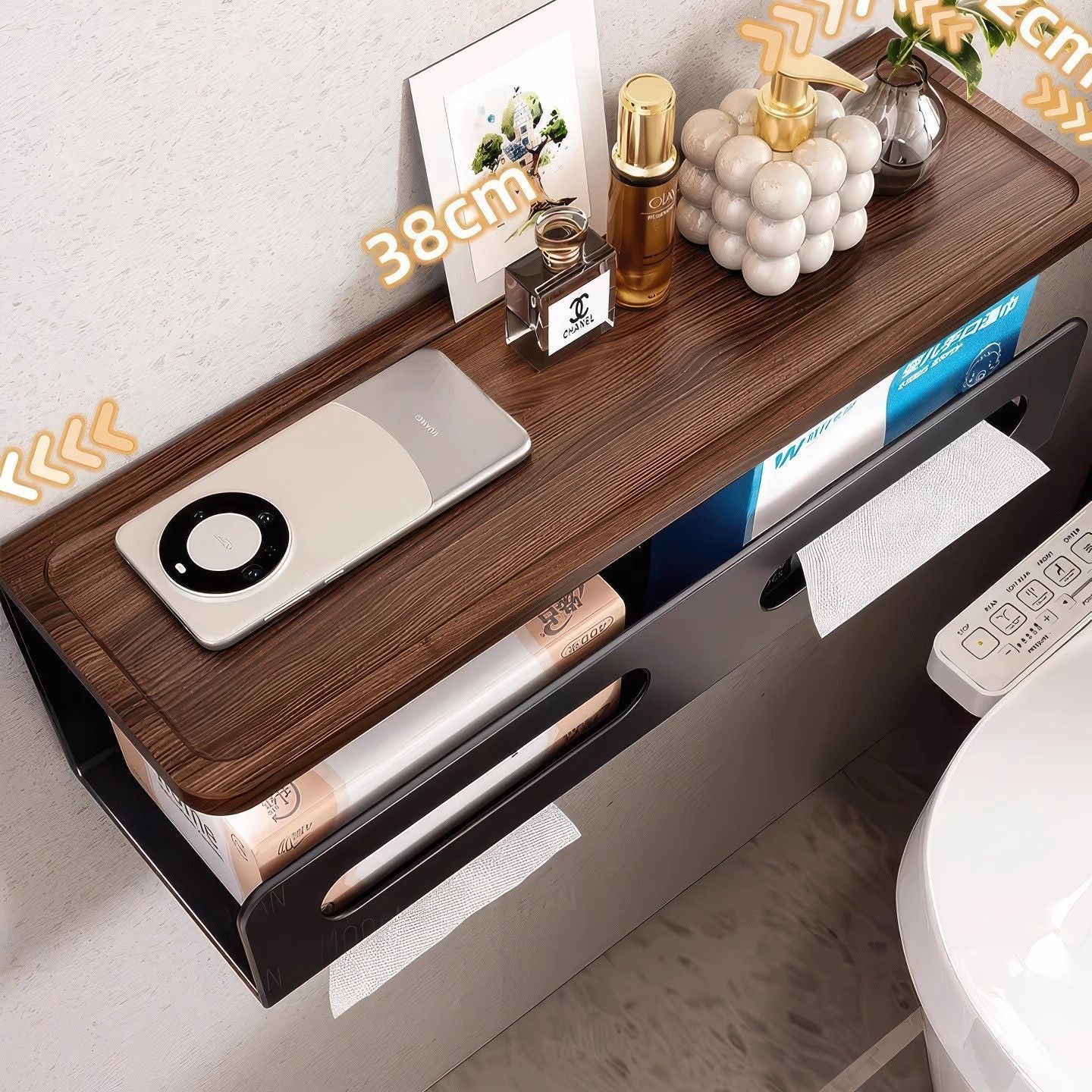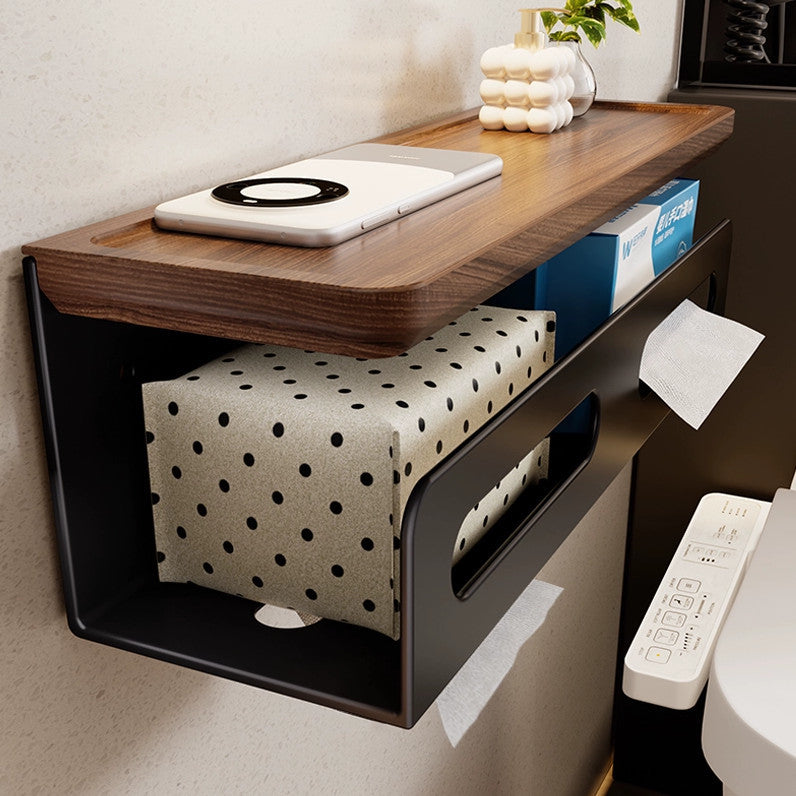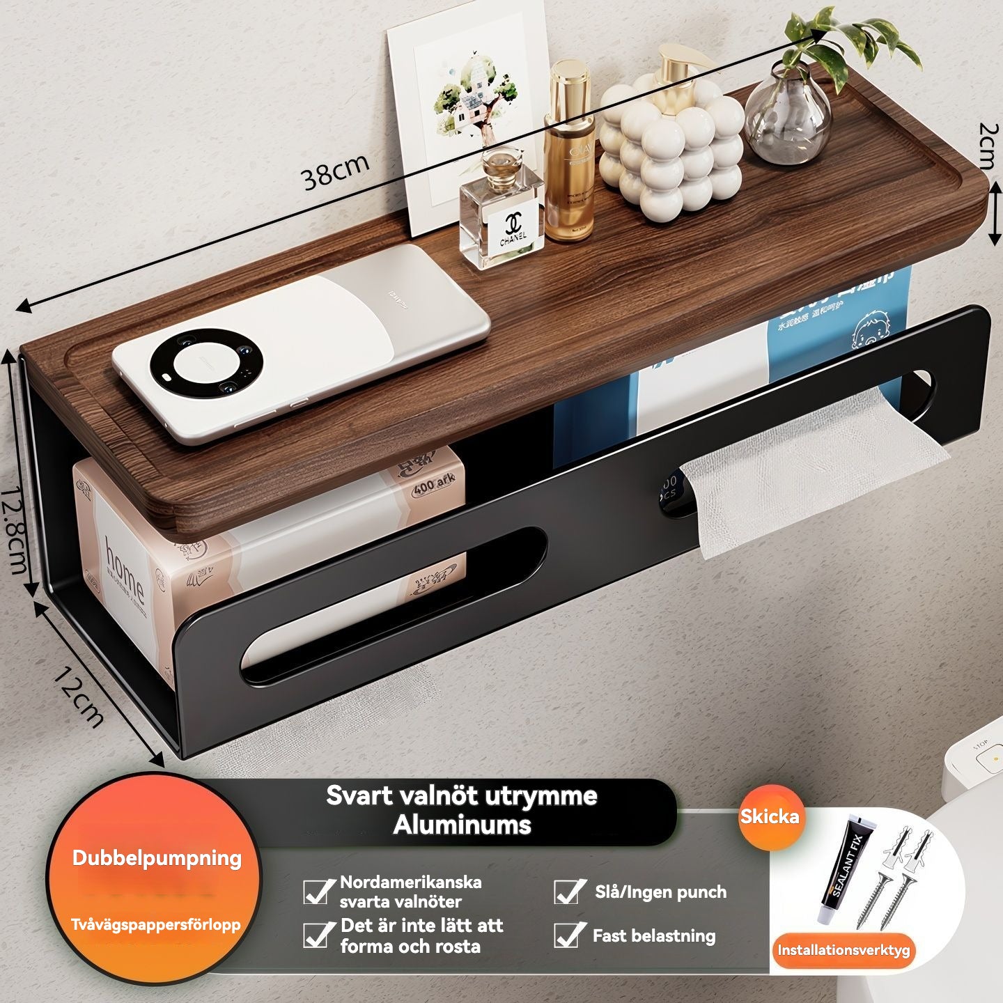 Maximera din förvaring och skapa en sofistikerad atmosfär i badrummet med denna rymliga och eleganta vägghylla. Den kombinerar en robust metallram med en lyxig topp i äkta nordamerikansk svart valnöt. Den smarta designen med dubbelt uttag gör den perfekt för att organisera allt från ansiktsservetter och våtservetter till toalettrullar och andra badrumsartiklar.